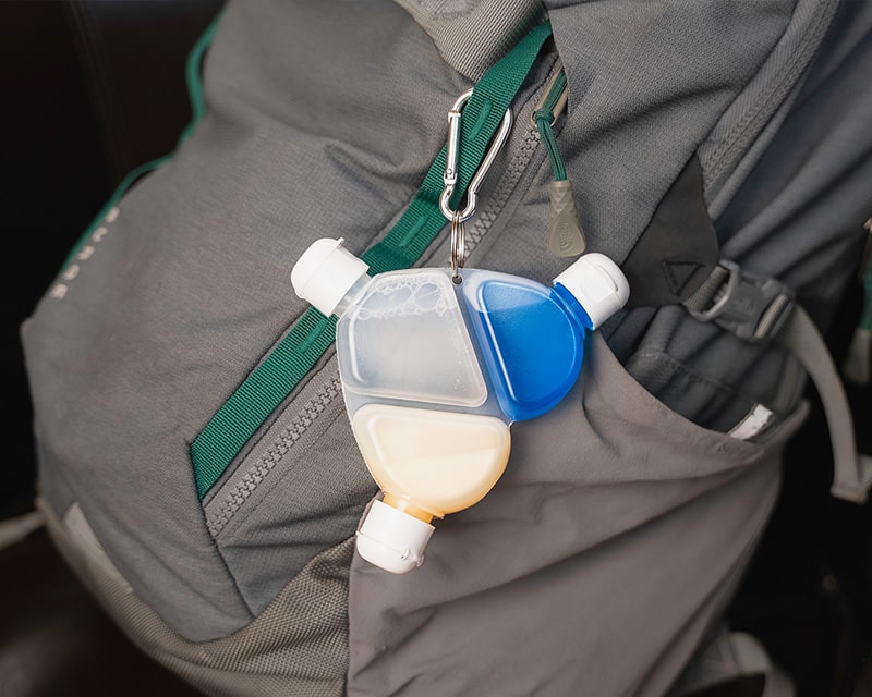 With VitalTrio, you’ll always know you have everything you need within reach when you’re out and about. One unit with three leak-proof chambers for your choice of liquids and gels. Perfect for holding hand sanitizer, lotion, shampoo, or any combination of products you need to take along on your next adventure.